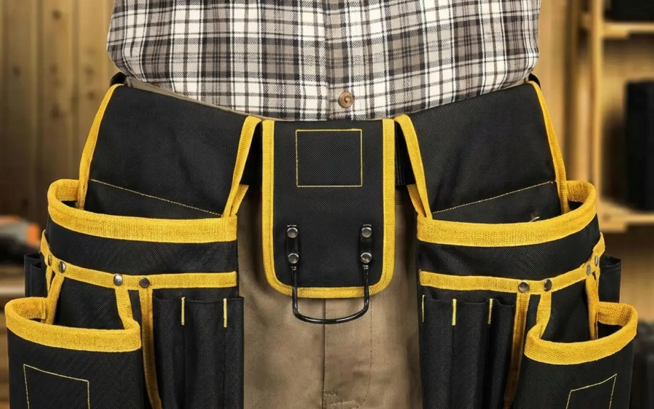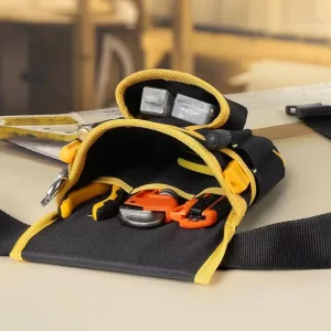 I wear this pouch on long shifts wiring houses. The padded band saves my hips, and I can grab tape, cutters, screws without looking down.