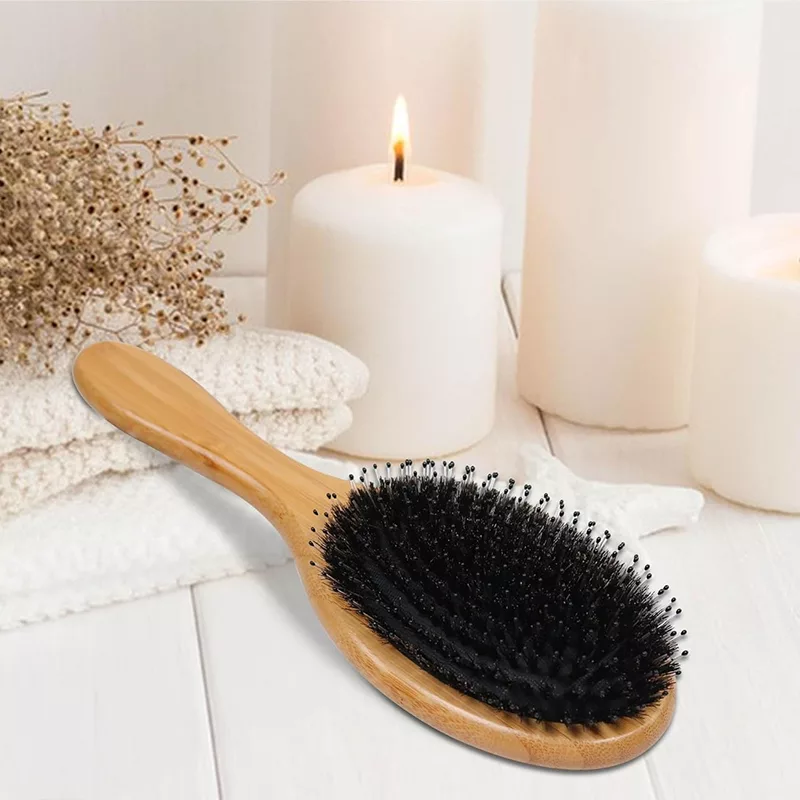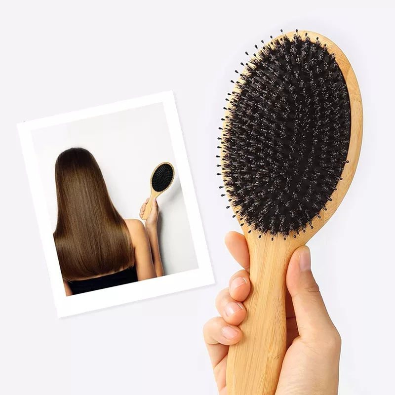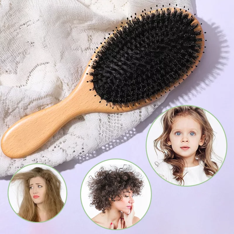 Boar bristles distribute oils evenly from root to tip. This helps hair stay silky, shiny, and less prone to breakage.