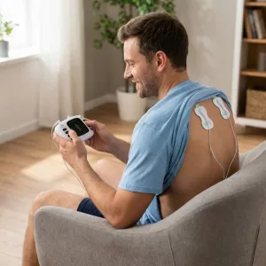 I use the stim on my shoulders while reading in bed. The soft pulses calm the muscles, and by the time it shuts off, I’m ready to sleep.