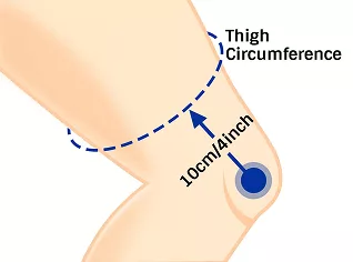 - 2. Wrap the measuring tape around the widest part of your thigh from about 10cm/4" above the midpoint of your kneecap.