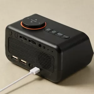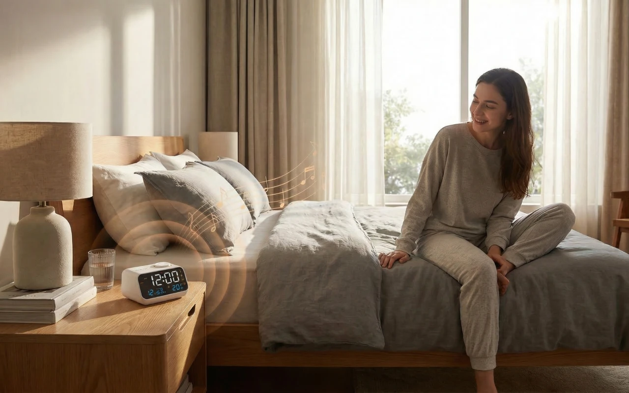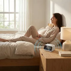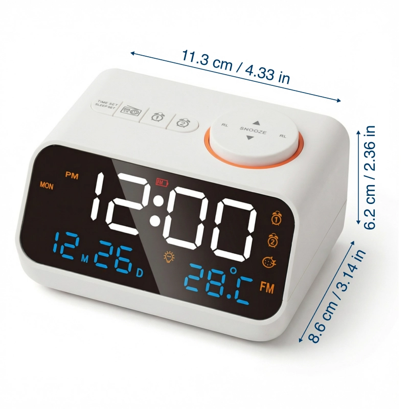I keep this on my nightstand. The dimmable screen is gentle on my eyes, and the USB ports save space by charging my phone and tablet.