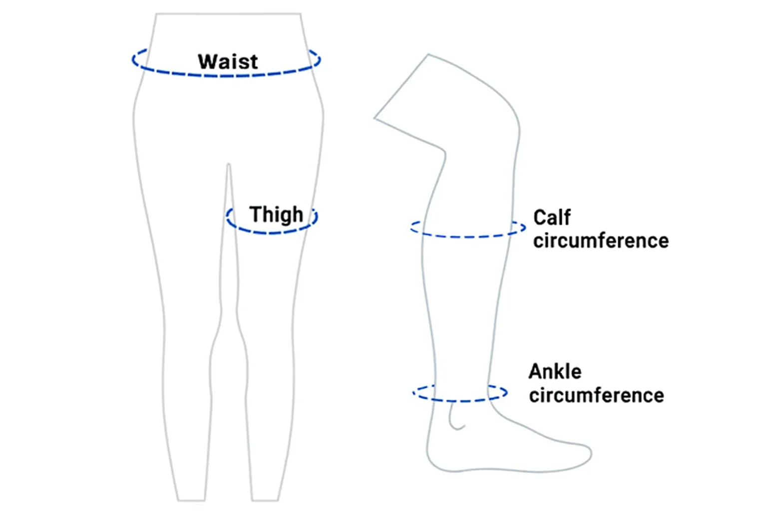 | SIZE | WAISTLINE | THIGH | CALF | ANKLE | ||||