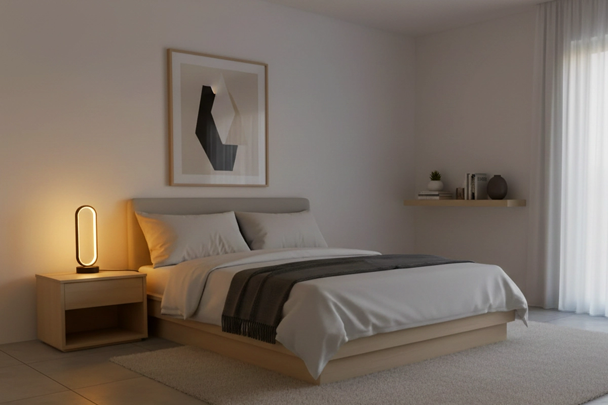 The lamp’s shape saves space and looks really stylish. It’s not too bright, which is great for relaxing after a long day.