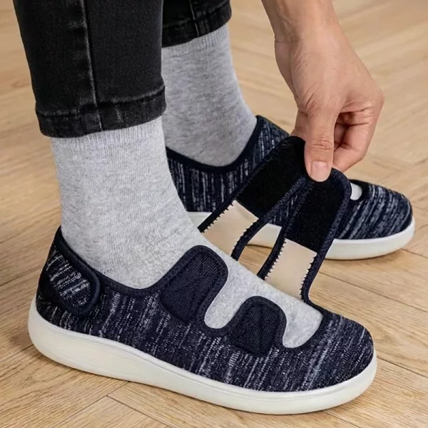 I bought these wide shoes for my sore arches, and the relief almost instant. Velcro straps keep them snug even when my feet swell.