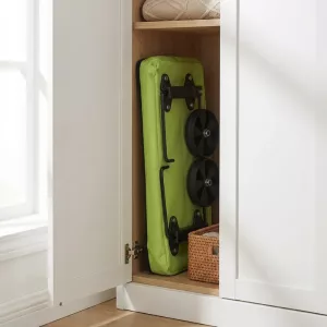 The carrier folds into a slim bundle that fits in narrow cupboards. Lightweight body hangs neatly behind doors, freeing precious hallway space.