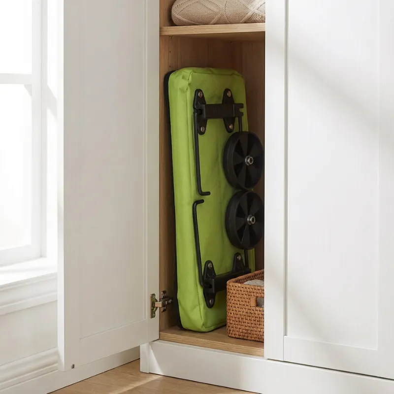 Got this cart after my shoulder surgery. Now I load heavy bottles and fruit without worrying. It folds in seconds and slides beside the wardrobe easily.