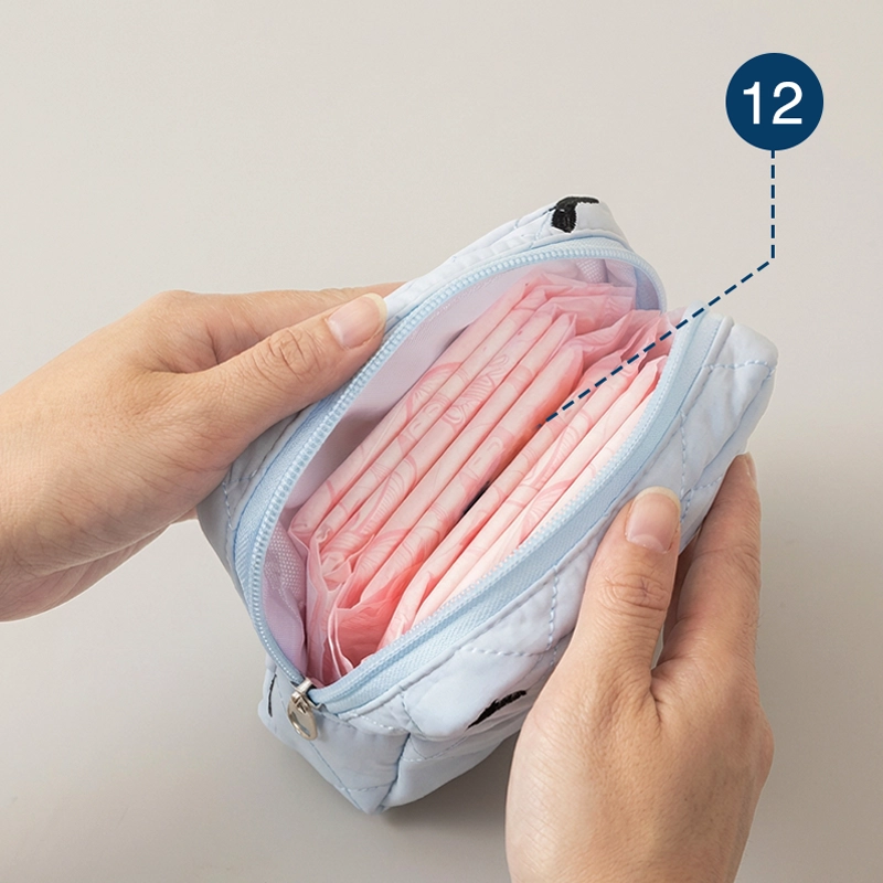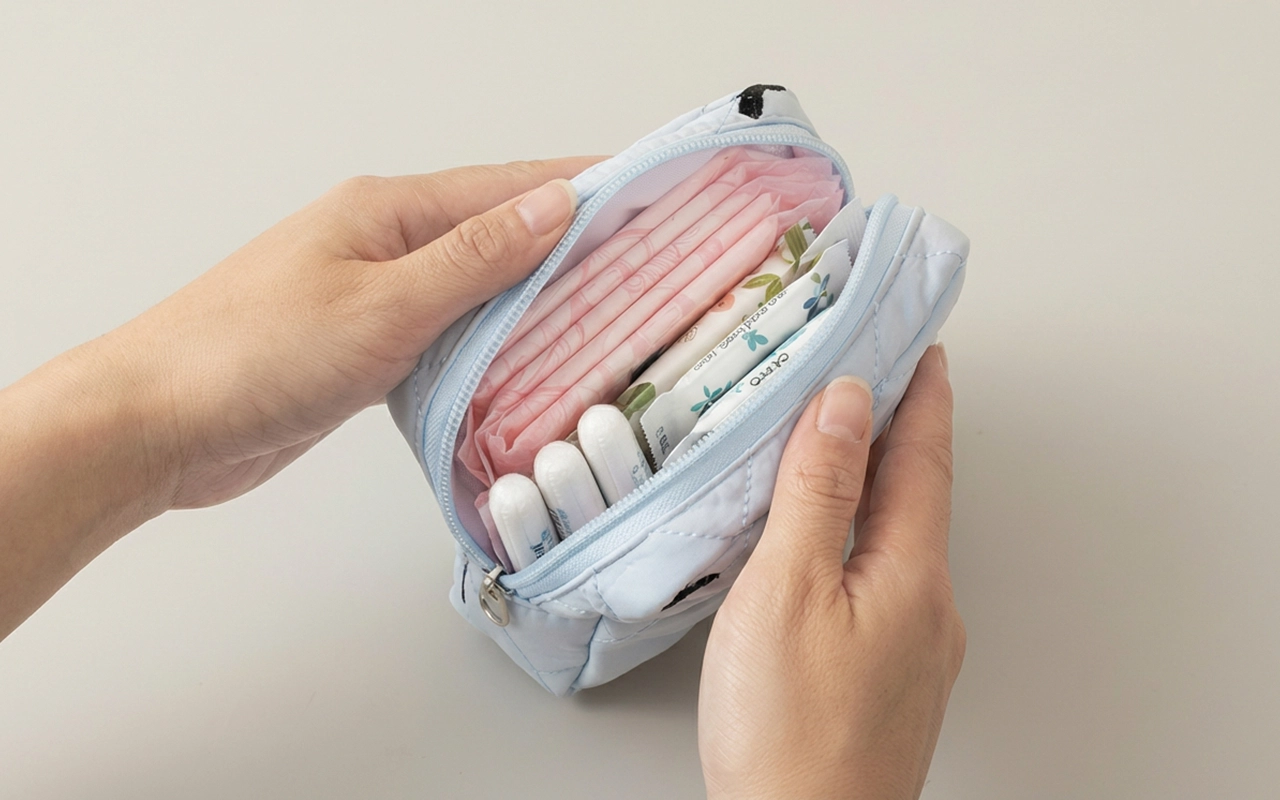 I always keep my blue pouch with me. It fits pads, liners, and even a small pack of tissues. Really makes my school days easier.