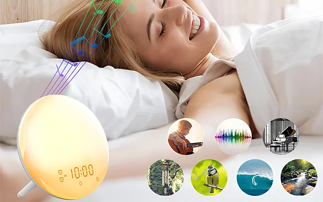 Our alarm clock offers various options, including ocean, piano, bird, and traditional beep.