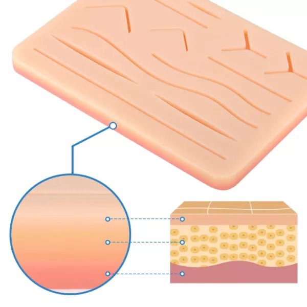 The pad mimics real human tissue, offering skin, fat, and muscle layers. Practice various techniques on different wound types for comprehensive learning.