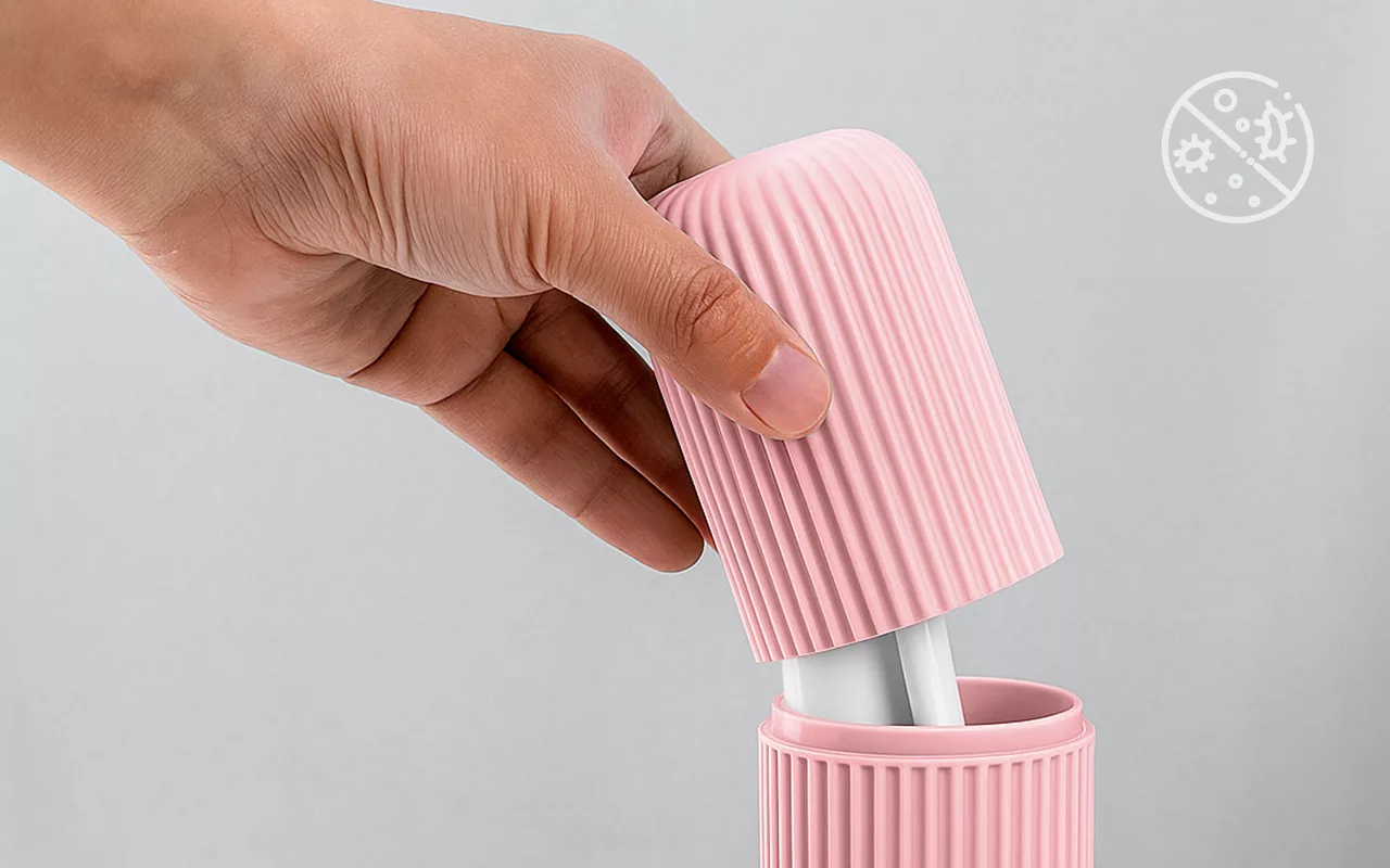 The material prevents germs and dirt from reaching your toothbrush or paste.