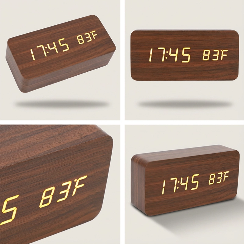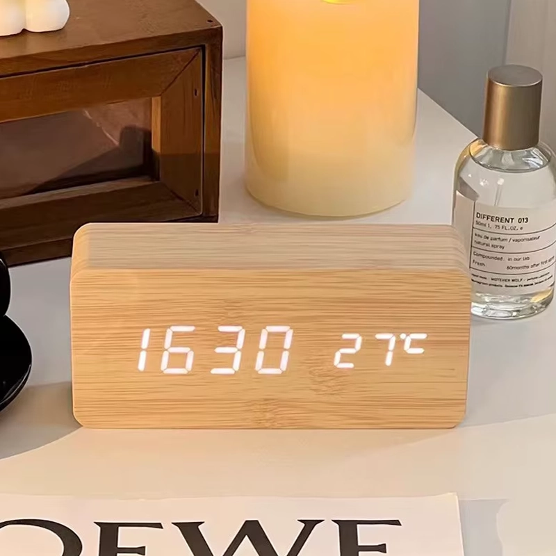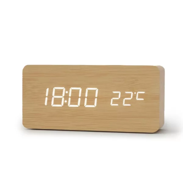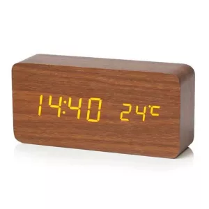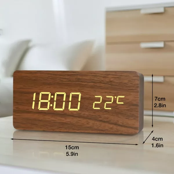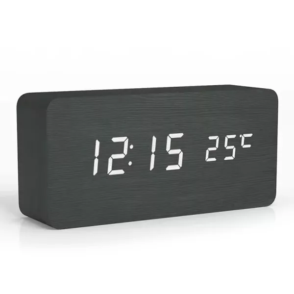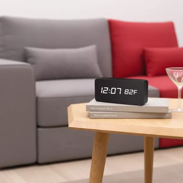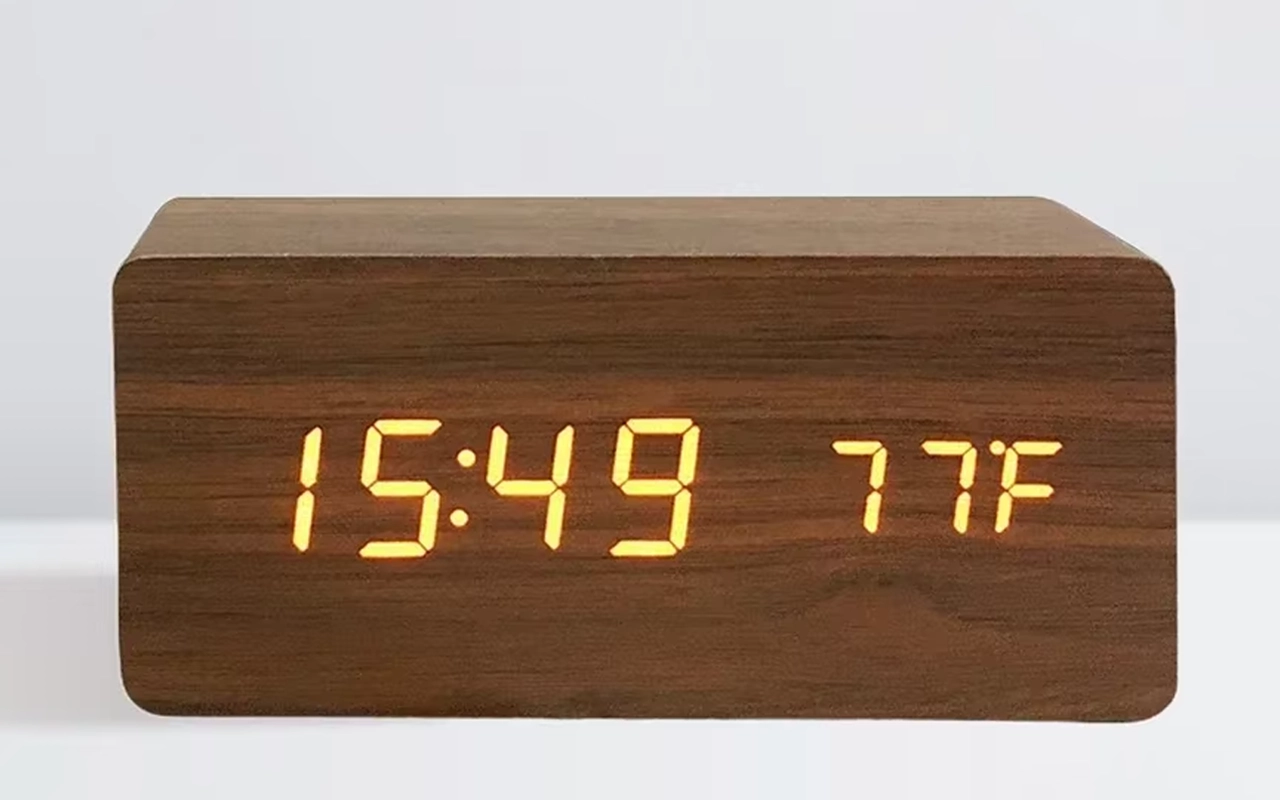 Love how modern this wooden alarm looks. It never clashes with my furniture, and having the temperature right there is a bonus.